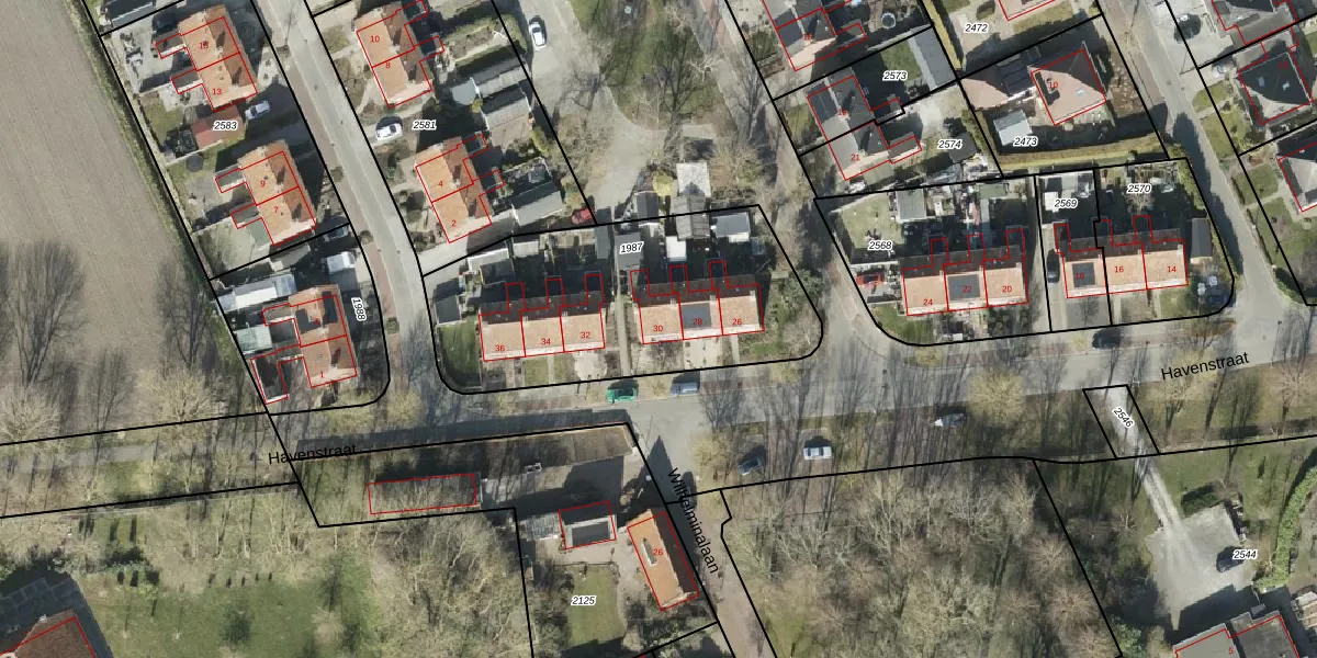 Het perceel waarop Havenstraat 30 staat heeft een oppervlakte van 1287 m². Dit is een zeer groot perceel. De perceeloppervlakte wordt geregistreerd door het Kadaster. Gedetailleerde informatie over de maten van dit perceel kunt u vinden in het rapport Kadastrale kaart met maatvoering van Havenstraat 30.