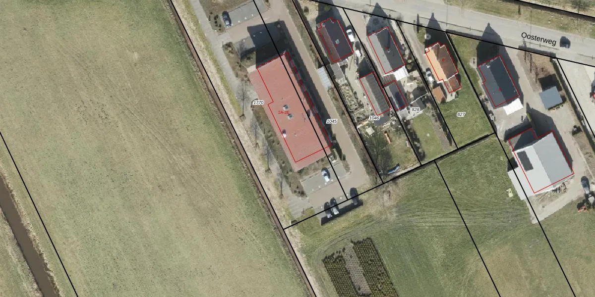Oosterweg 2-B is gelegen op kadastraal perceel MWD01M1770. Deze kadastrale aanduiding is uniek en wordt gebruikt door het Kadaster om eigendomsrechten en andere zakelijke rechten vast te leggen. Het perceel maakt onderdeel uit van de kadastrale gemeente Midwolda.