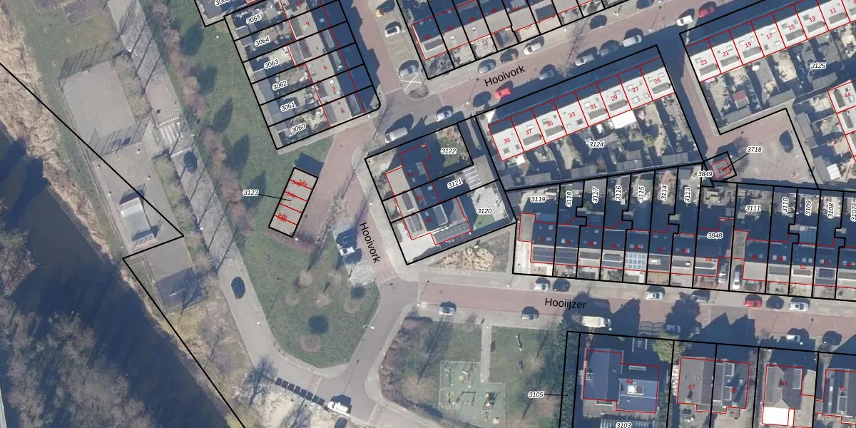 Hooivork 45 is gelegen op kadastraal perceel OZN00C3120. Deze kadastrale aanduiding is uniek en wordt gebruikt door het Kadaster om eigendomsrechten en andere zakelijke rechten vast te leggen. Het perceel maakt onderdeel uit van de kadastrale gemeente Oostzaan.