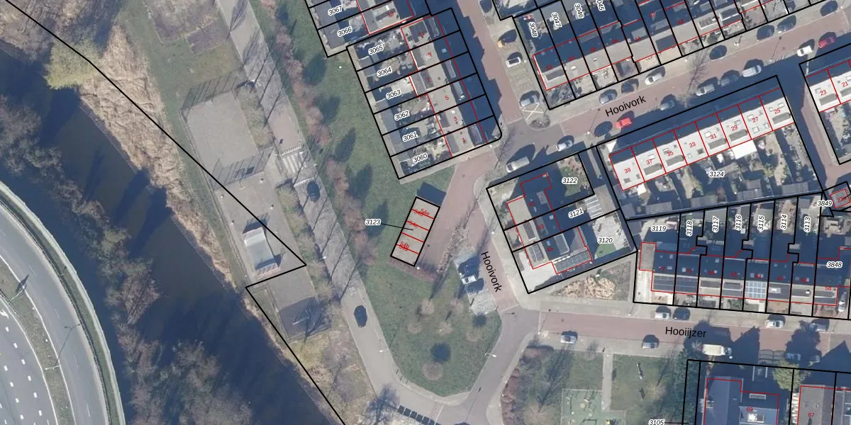 Hooivork 54-e is gelegen op kadastraal perceel OZN00C3123. Deze kadastrale aanduiding is uniek en wordt gebruikt door het Kadaster om eigendomsrechten en andere zakelijke rechten vast te leggen. Het perceel maakt onderdeel uit van de kadastrale gemeente Oostzaan.