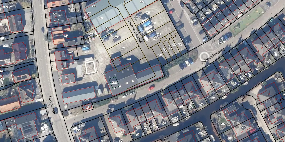 Jollenmakershof 1 is gelegen op kadastraal perceel OZN00G1001. Deze kadastrale aanduiding is uniek en wordt gebruikt door het Kadaster om eigendomsrechten en andere zakelijke rechten vast te leggen. Het perceel maakt onderdeel uit van de kadastrale gemeente Oostzaan.