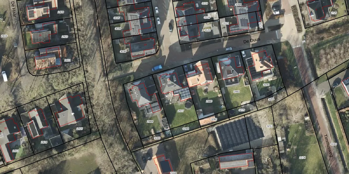 Het perceel waarop De Duus 18 staat heeft een oppervlakte van 577 m². Dit is een groot perceel. De perceeloppervlakte wordt geregistreerd door het Kadaster. Gedetailleerde informatie over de maten van dit perceel kunt u vinden in het rapport Kadastrale kaart met maatvoering van De Duus 18.