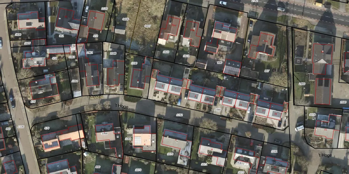 Het perceel waarop 't Hoge 7 staat heeft een oppervlakte van 1942 m². Dit is een zeer groot perceel. De perceeloppervlakte wordt geregistreerd door het Kadaster. Gedetailleerde informatie over de maten van dit perceel kunt u vinden in het rapport Kadastrale kaart met maatvoering van 't Hoge 7.