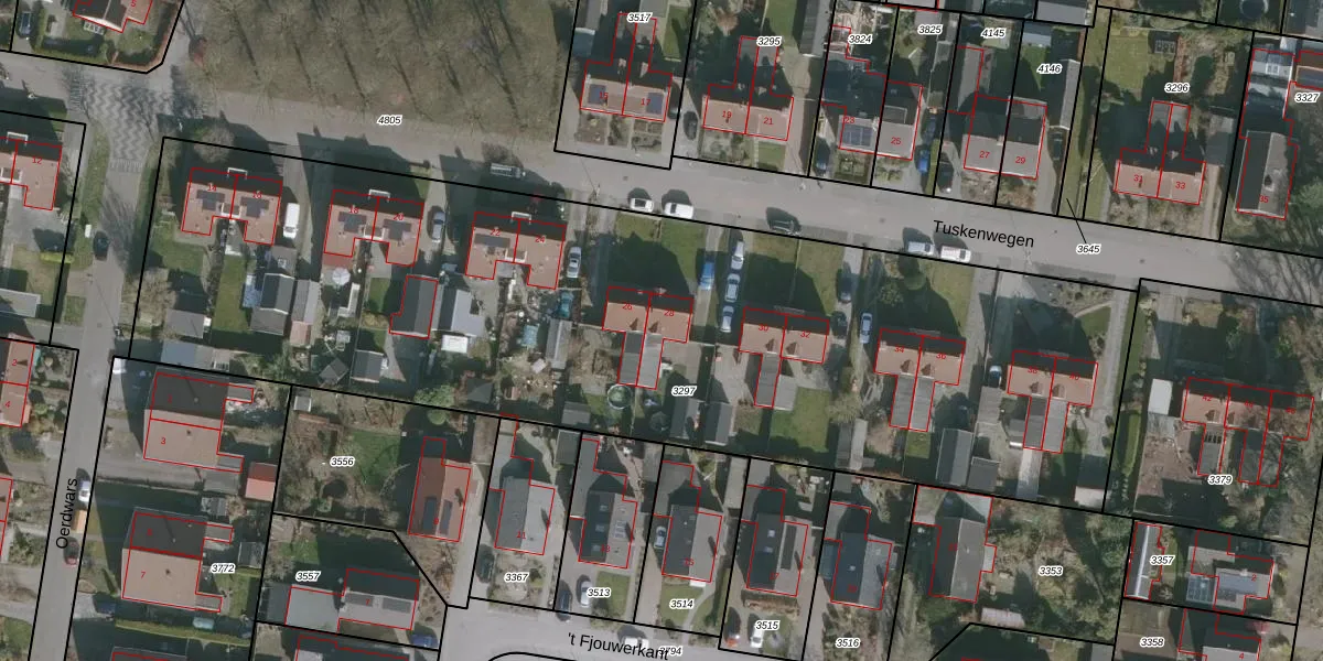 Het perceel waarop Tuskenwegen 28 staat heeft een oppervlakte van 5065 m². Dit is een zeer groot perceel. De perceeloppervlakte wordt geregistreerd door het Kadaster. Gedetailleerde informatie over de maten van dit perceel kunt u vinden in het rapport Kadastrale kaart met maatvoering van Tuskenwegen 28.