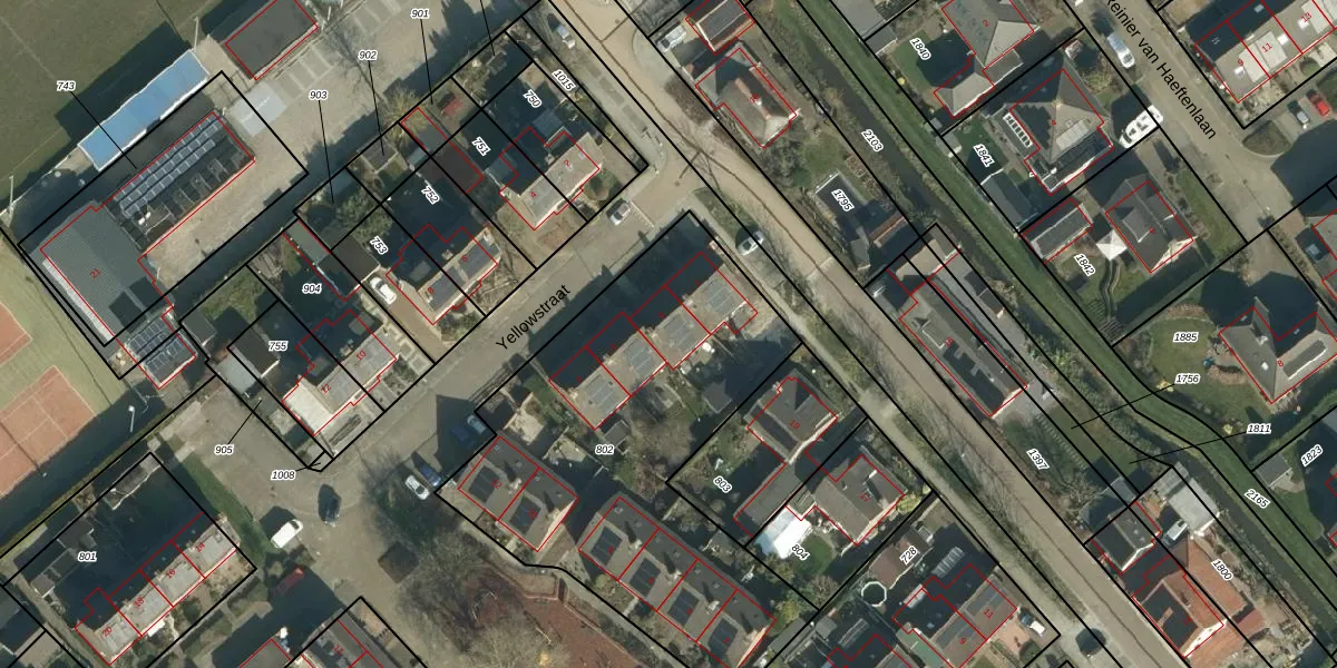 Het perceel waarop Yellowstraat 3 staat heeft een oppervlakte van 1993 m². Dit is een zeer groot perceel. De perceeloppervlakte wordt geregistreerd door het Kadaster. Gedetailleerde informatie over de maten van dit perceel kunt u vinden in het rapport Kadastrale kaart met maatvoering van Yellowstraat 3.