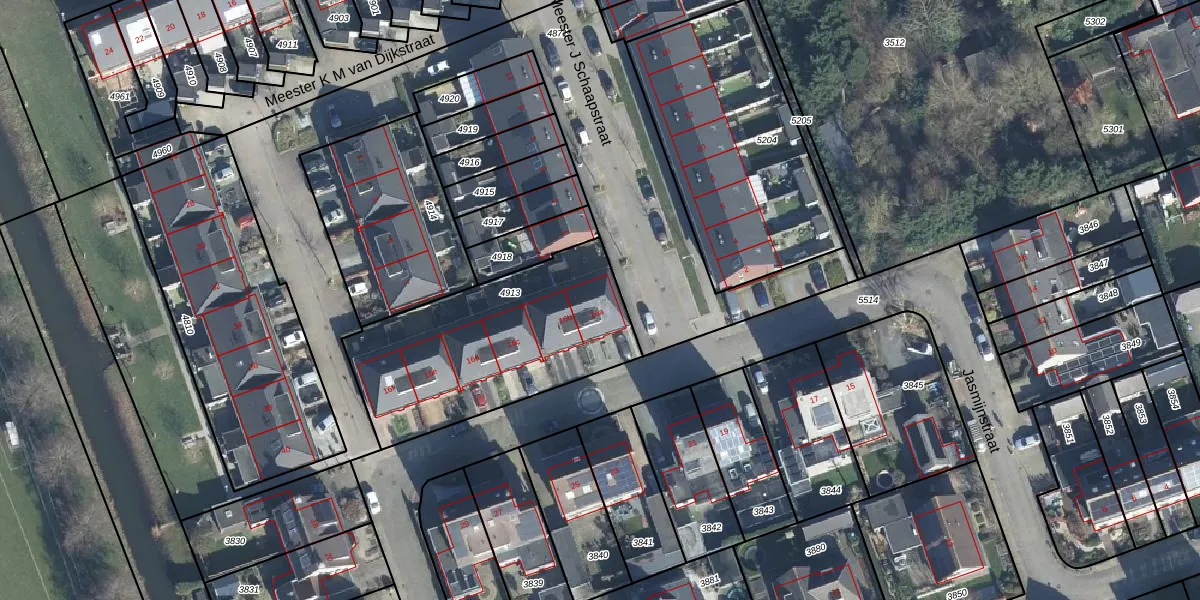 Het perceel waarop Jasmijnstraat 16-a staat heeft een oppervlakte van 950 m². Dit is een groot perceel. De perceeloppervlakte wordt geregistreerd door het Kadaster. Gedetailleerde informatie over de maten van dit perceel kunt u vinden in het rapport Kadastrale kaart met maatvoering van Jasmijnstraat 16-a.