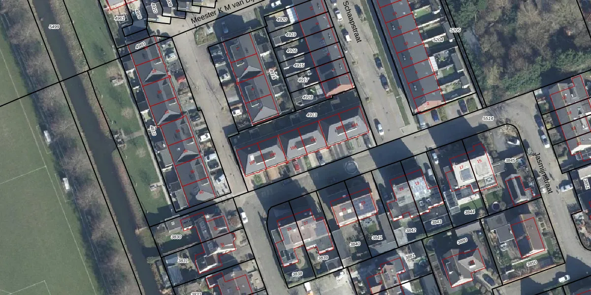 Het perceel waarop Jasmijnstraat 16-d staat heeft een oppervlakte van 950 m². Dit is een groot perceel. De perceeloppervlakte wordt geregistreerd door het Kadaster. Gedetailleerde informatie over de maten van dit perceel kunt u vinden in het rapport Kadastrale kaart met maatvoering van Jasmijnstraat 16-d.