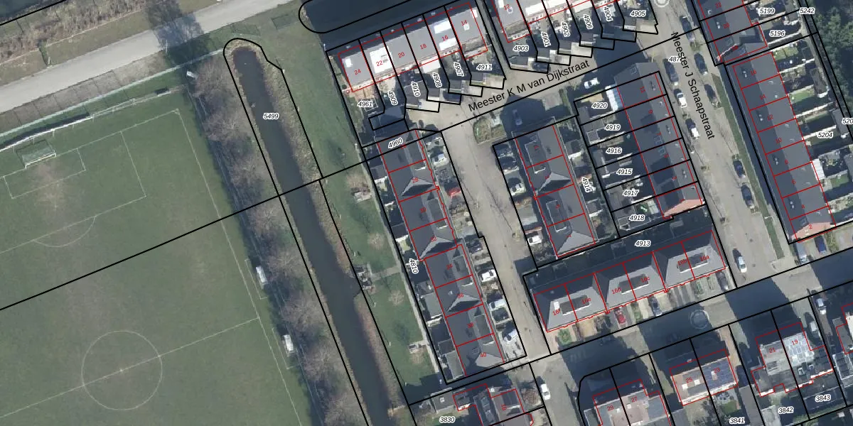 Het perceel waarop Meester K M van Dijkstraat 30 staat heeft een oppervlakte van 1085 m². Dit is een zeer groot perceel. De perceeloppervlakte wordt geregistreerd door het Kadaster. Gedetailleerde informatie over de maten van dit perceel kunt u vinden in het rapport Kadastrale kaart met maatvoering van Meester K M van Dijkstraat 30.