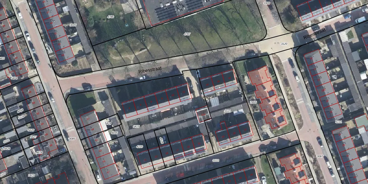 Het perceel waarop Ribesstraat 12 staat heeft een oppervlakte van 2842 m². Dit is een zeer groot perceel. De perceeloppervlakte wordt geregistreerd door het Kadaster. Gedetailleerde informatie over de maten van dit perceel kunt u vinden in het rapport Kadastrale kaart met maatvoering van Ribesstraat 12.