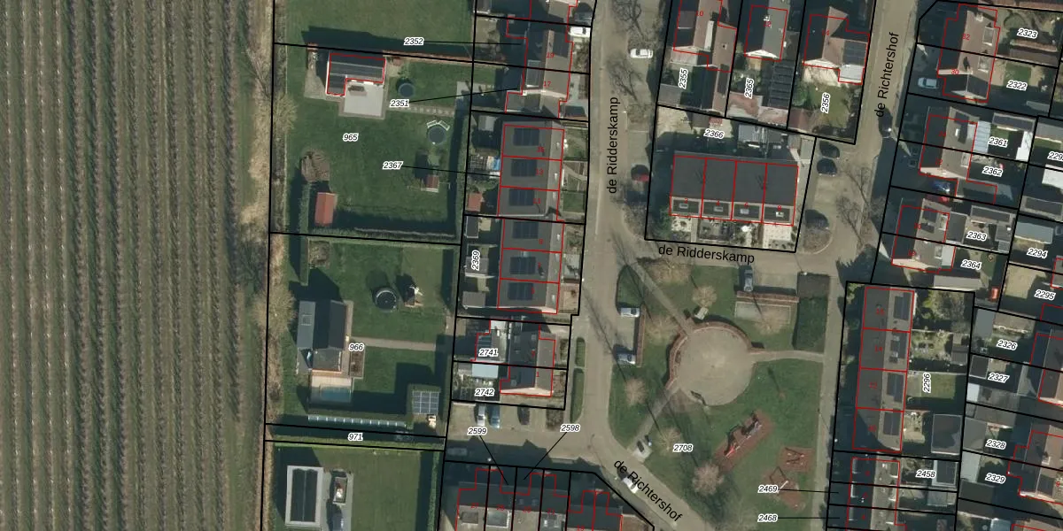 de Ridderskamp 7 is gelegen op kadastraal perceel EST00C2369. Deze kadastrale aanduiding is uniek en wordt gebruikt door het Kadaster om eigendomsrechten en andere zakelijke rechten vast te leggen. Het perceel maakt onderdeel uit van de kadastrale gemeente Est en Opijnen.