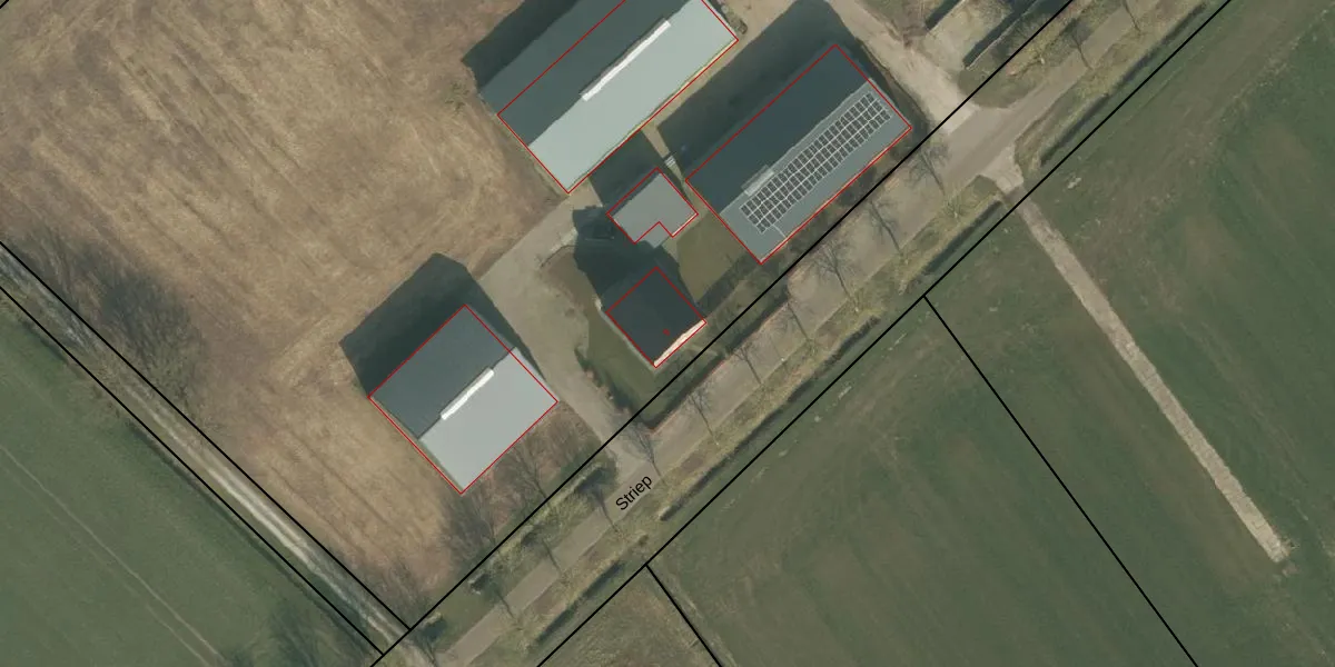 Het perceel waarop Striep 9 staat heeft een oppervlakte van 5,0 ha. Dit is een zeer groot perceel. De perceeloppervlakte wordt geregistreerd door het Kadaster. Gedetailleerde informatie over de maten van dit perceel kunt u vinden in het rapport Kadastrale kaart met maatvoering van Striep 9.