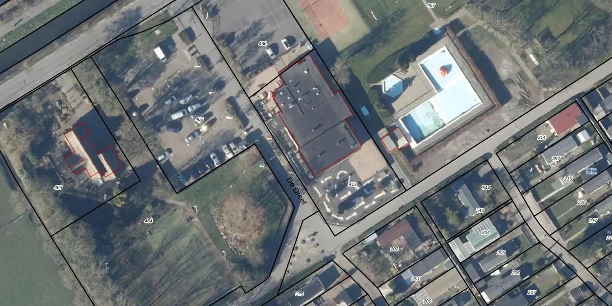 De Dreef 1 is gelegen op kadastraal perceel OMR01T413. Deze kadastrale aanduiding is uniek en wordt gebruikt door het Kadaster om eigendomsrechten en andere zakelijke rechten vast te leggen. Het perceel maakt onderdeel uit van de kadastrale gemeente Opmeer.