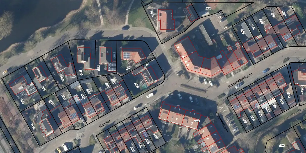 Het perceel waarop Koekoeksbloem 14 staat heeft een oppervlakte van 412 m². Dit is een groot perceel. De perceeloppervlakte wordt geregistreerd door het Kadaster. Gedetailleerde informatie over de maten van dit perceel kunt u vinden in het rapport Kadastrale kaart met maatvoering van Koekoeksbloem 14.