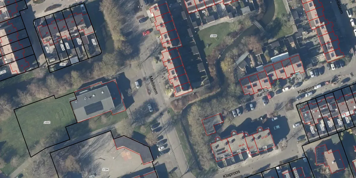 Het perceel waarop Meibloem 39 staat heeft een oppervlakte van 5,4 ha. Dit is een zeer groot perceel. De perceeloppervlakte wordt geregistreerd door het Kadaster. Gedetailleerde informatie over de maten van dit perceel kunt u vinden in het rapport Kadastrale kaart met maatvoering van Meibloem 39.