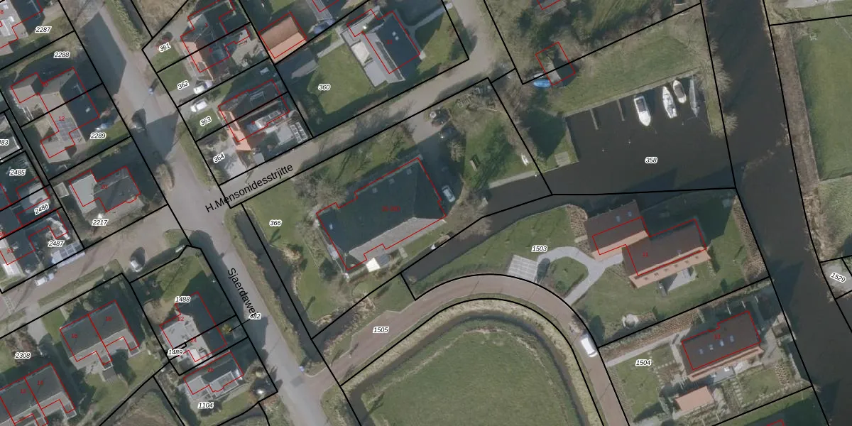 Het perceel waarop H.Mensonidesstrjitte 20-A staat heeft een oppervlakte van 2053 m². Dit is een zeer groot perceel. De perceeloppervlakte wordt geregistreerd door het Kadaster. Gedetailleerde informatie over de maten van dit perceel kunt u vinden in het rapport Kadastrale kaart met maatvoering van H.Mensonidesstrjitte 20-A.