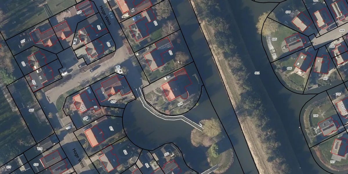 Het perceel waarop Hoge Weis 9 staat heeft een oppervlakte van 685 m². Dit is een groot perceel. De perceeloppervlakte wordt geregistreerd door het Kadaster. Gedetailleerde informatie over de maten van dit perceel kunt u vinden in het rapport Kadastrale kaart met maatvoering van Hoge Weis 9.
