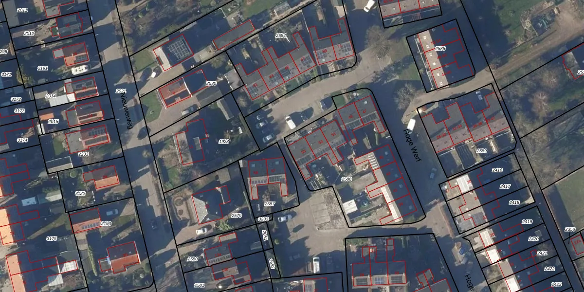 Het perceel waarop Hoge Werf 55 staat heeft een oppervlakte van 1325 m². Dit is een zeer groot perceel. De perceeloppervlakte wordt geregistreerd door het Kadaster. Gedetailleerde informatie over de maten van dit perceel kunt u vinden in het rapport Kadastrale kaart met maatvoering van Hoge Werf 55.