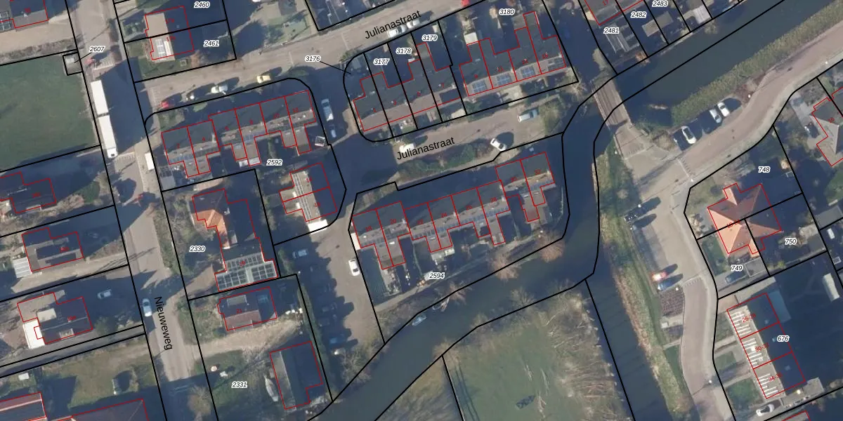 Julianastraat 22 is gelegen op kadastraal perceel KGL01T2594. Deze kadastrale aanduiding is uniek en wordt gebruikt door het Kadaster om eigendomsrechten en andere zakelijke rechten vast te leggen. Het perceel maakt onderdeel uit van de kadastrale gemeente Noorder-Koggenland.