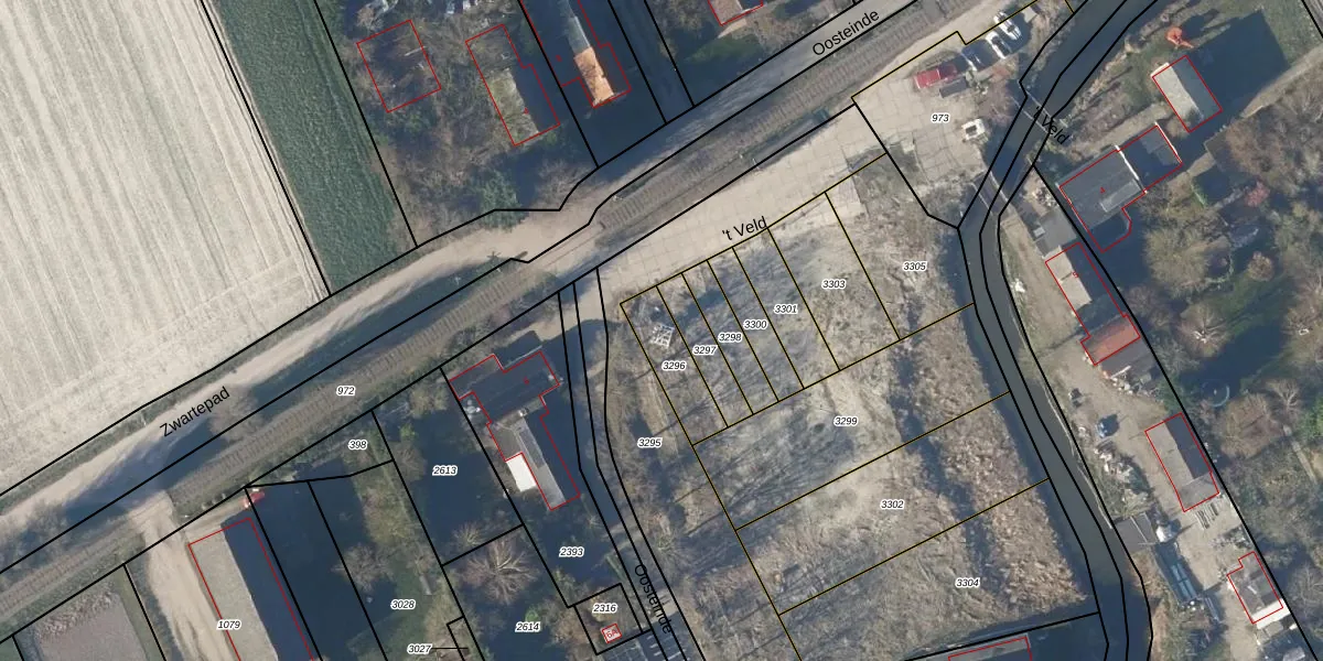 't Veld 12 is gelegen op kadastraal perceel KGL01T3296. Deze kadastrale aanduiding is uniek en wordt gebruikt door het Kadaster om eigendomsrechten en andere zakelijke rechten vast te leggen. Het perceel maakt onderdeel uit van de kadastrale gemeente Noorder-Koggenland.