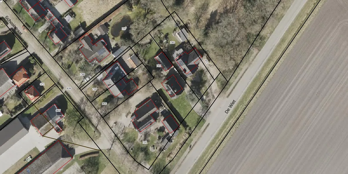 Het perceel waarop De Wiet 2 staat heeft een oppervlakte van 758 m². Dit is een groot perceel. De perceeloppervlakte wordt geregistreerd door het Kadaster. Gedetailleerde informatie over de maten van dit perceel kunt u vinden in het rapport Kadastrale kaart met maatvoering van De Wiet 2.