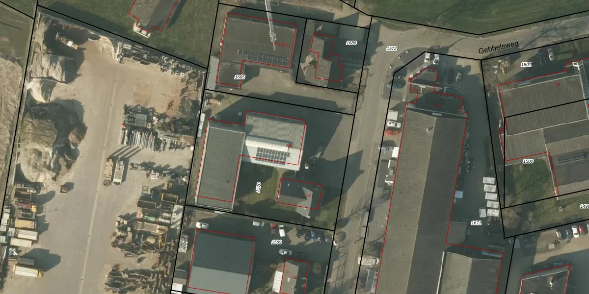 Het perceel waarop Gebbelsweg 25-A staat heeft een oppervlakte van 2065 m². Dit is een zeer groot perceel. De perceeloppervlakte wordt geregistreerd door het Kadaster. Gedetailleerde informatie over de maten van dit perceel kunt u vinden in het rapport Kadastrale kaart met maatvoering van Gebbelsweg 25-A.