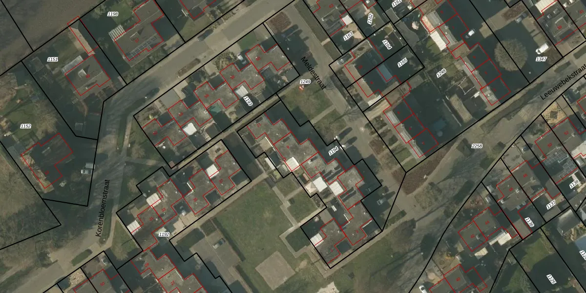 Het perceel waarop Meldestraat 9 staat heeft een oppervlakte van 1165 m². Dit is een zeer groot perceel. De perceeloppervlakte wordt geregistreerd door het Kadaster. Gedetailleerde informatie over de maten van dit perceel kunt u vinden in het rapport Kadastrale kaart met maatvoering van Meldestraat 9.