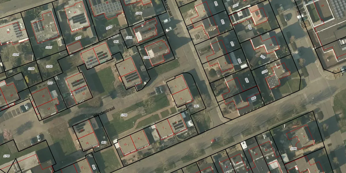 Het perceel waarop Windestraat 1 staat heeft een oppervlakte van 1060 m². Dit is een zeer groot perceel. De perceeloppervlakte wordt geregistreerd door het Kadaster. Gedetailleerde informatie over de maten van dit perceel kunt u vinden in het rapport Kadastrale kaart met maatvoering van Windestraat 1.