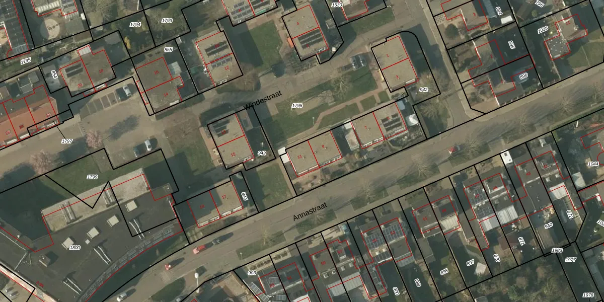 Het perceel waarop Windestraat 11 staat heeft een oppervlakte van 1060 m². Dit is een zeer groot perceel. De perceeloppervlakte wordt geregistreerd door het Kadaster. Gedetailleerde informatie over de maten van dit perceel kunt u vinden in het rapport Kadastrale kaart met maatvoering van Windestraat 11.