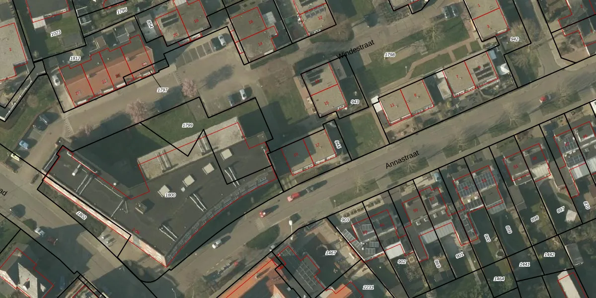 Het perceel waarop Windestraat 19 staat heeft een oppervlakte van 353 m². Dit is een groot perceel. De perceeloppervlakte wordt geregistreerd door het Kadaster. Gedetailleerde informatie over de maten van dit perceel kunt u vinden in het rapport Kadastrale kaart met maatvoering van Windestraat 19.