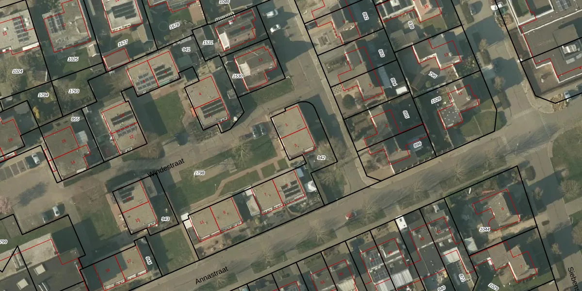 Het perceel waarop Windestraat 3 staat heeft een oppervlakte van 1060 m². Dit is een zeer groot perceel. De perceeloppervlakte wordt geregistreerd door het Kadaster. Gedetailleerde informatie over de maten van dit perceel kunt u vinden in het rapport Kadastrale kaart met maatvoering van Windestraat 3.