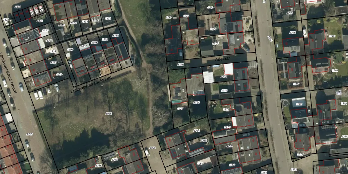 Het perceel waarop Adelaar 49 staat heeft een oppervlakte van 323 m². Dit is een groot perceel. De perceeloppervlakte wordt geregistreerd door het Kadaster. Gedetailleerde informatie over de maten van dit perceel kunt u vinden in het rapport Kadastrale kaart met maatvoering van Adelaar 49.