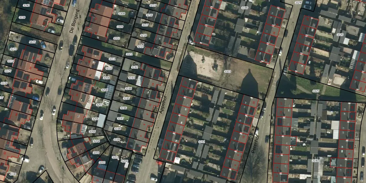 Het perceel waarop Appelhof 15 staat heeft een oppervlakte van 3151 m². Dit is een zeer groot perceel. De perceeloppervlakte wordt geregistreerd door het Kadaster. Gedetailleerde informatie over de maten van dit perceel kunt u vinden in het rapport Kadastrale kaart met maatvoering van Appelhof 15.