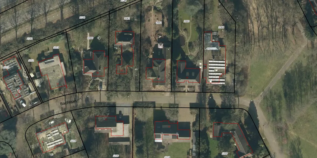 Het perceel waarop Bachlaan 21 staat heeft een oppervlakte van 1235 m². Dit is een zeer groot perceel. De perceeloppervlakte wordt geregistreerd door het Kadaster. Gedetailleerde informatie over de maten van dit perceel kunt u vinden in het rapport Kadastrale kaart met maatvoering van Bachlaan 21.