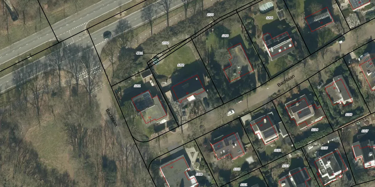 Het perceel waarop Bachlaan 49 staat heeft een oppervlakte van 993 m². Dit is een groot perceel. De perceeloppervlakte wordt geregistreerd door het Kadaster. Gedetailleerde informatie over de maten van dit perceel kunt u vinden in het rapport Kadastrale kaart met maatvoering van Bachlaan 49.