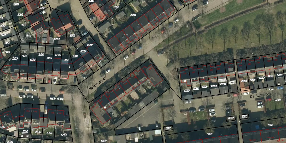 Het perceel waarop Baljuwstraat 130 staat heeft een oppervlakte van 2667 m². Dit is een zeer groot perceel. De perceeloppervlakte wordt geregistreerd door het Kadaster. Gedetailleerde informatie over de maten van dit perceel kunt u vinden in het rapport Kadastrale kaart met maatvoering van Baljuwstraat 130.