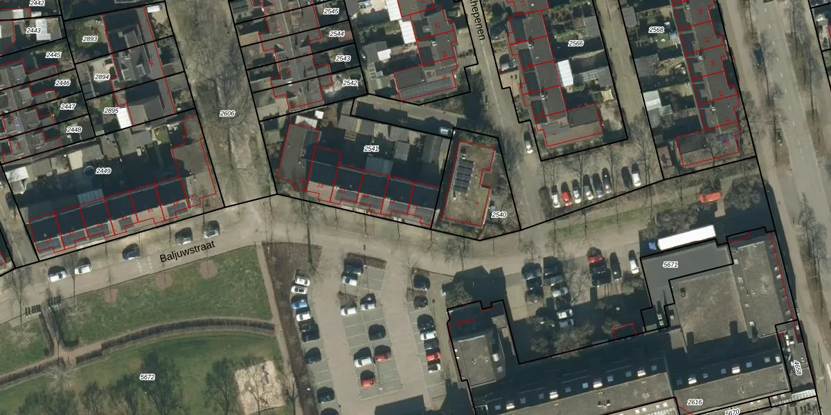 Het perceel waarop Baljuwstraat 15 staat heeft een oppervlakte van 948 m². Dit is een groot perceel. De perceeloppervlakte wordt geregistreerd door het Kadaster. Gedetailleerde informatie over de maten van dit perceel kunt u vinden in het rapport Kadastrale kaart met maatvoering van Baljuwstraat 15.