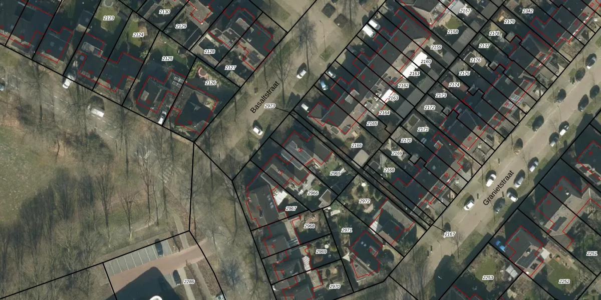 Het perceel waarop Basaltstraat 56 staat heeft een oppervlakte van 300 m². Dit is een groot perceel. De perceeloppervlakte wordt geregistreerd door het Kadaster. Gedetailleerde informatie over de maten van dit perceel kunt u vinden in het rapport Kadastrale kaart met maatvoering van Basaltstraat 56.