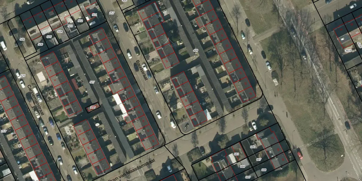 Baudstraat 18 is gelegen op kadastraal perceel OSS00L499. Deze kadastrale aanduiding is uniek en wordt gebruikt door het Kadaster om eigendomsrechten en andere zakelijke rechten vast te leggen. Het perceel maakt onderdeel uit van de kadastrale gemeente Oss.