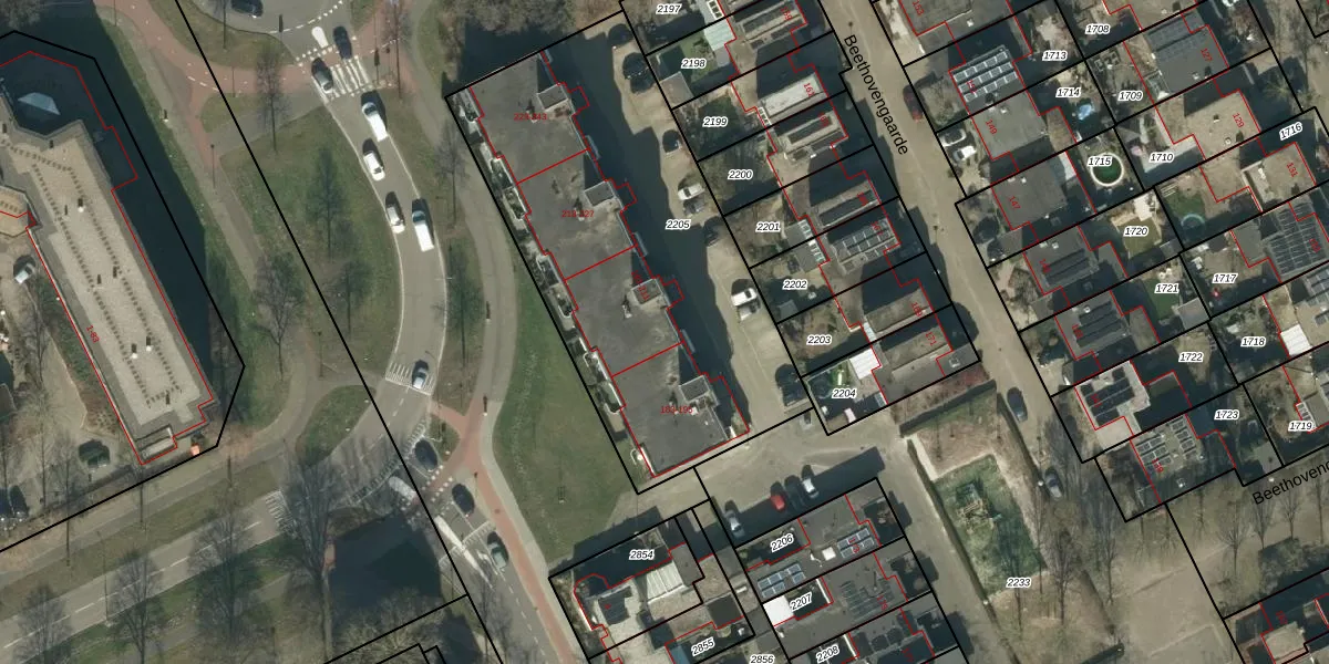 Het perceel waarop Beethovengaarde 199 staat heeft een oppervlakte van 1995 m². Dit is een zeer groot perceel. De perceeloppervlakte wordt geregistreerd door het Kadaster. Gedetailleerde informatie over de maten van dit perceel kunt u vinden in het rapport Kadastrale kaart met maatvoering van Beethovengaarde 199.