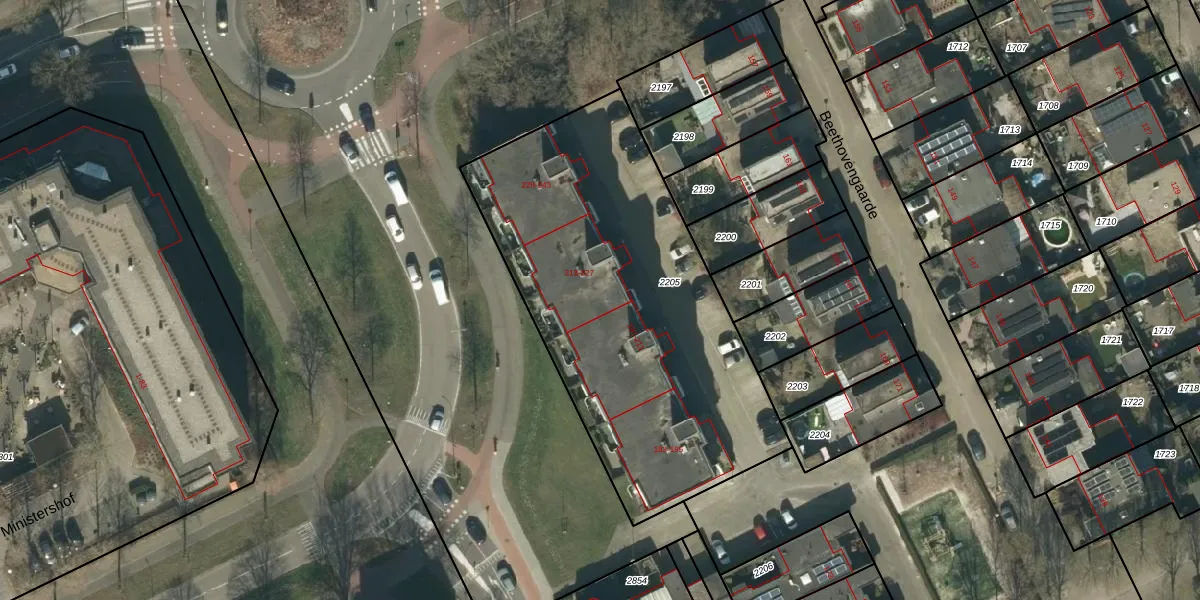 Het perceel waarop Beethovengaarde 219 staat heeft een oppervlakte van 1995 m². Dit is een zeer groot perceel. De perceeloppervlakte wordt geregistreerd door het Kadaster. Gedetailleerde informatie over de maten van dit perceel kunt u vinden in het rapport Kadastrale kaart met maatvoering van Beethovengaarde 219.