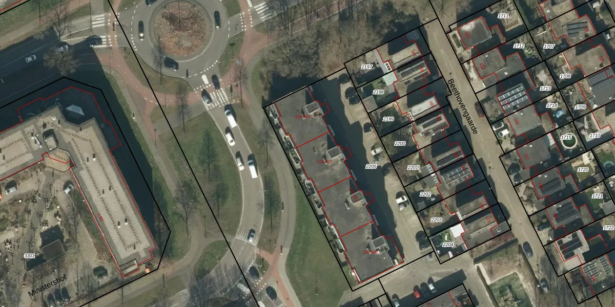 Het perceel waarop Beethovengaarde 225 staat heeft een oppervlakte van 1995 m². Dit is een zeer groot perceel. De perceeloppervlakte wordt geregistreerd door het Kadaster. Gedetailleerde informatie over de maten van dit perceel kunt u vinden in het rapport Kadastrale kaart met maatvoering van Beethovengaarde 225.
