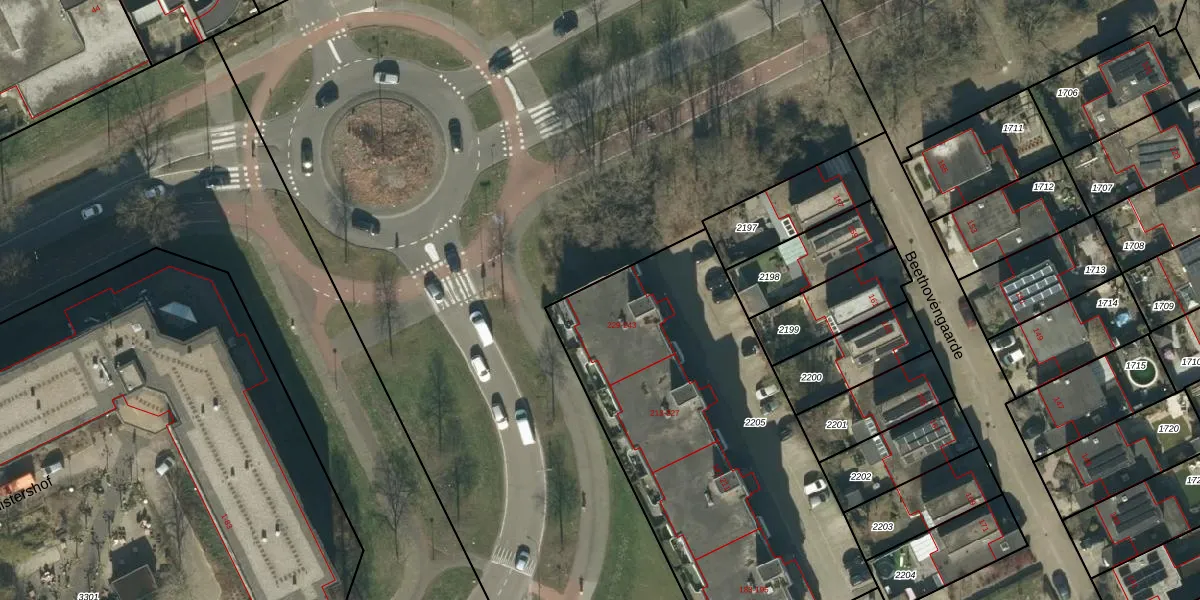 Het perceel waarop Beethovengaarde 237 staat heeft een oppervlakte van 1995 m². Dit is een zeer groot perceel. De perceeloppervlakte wordt geregistreerd door het Kadaster. Gedetailleerde informatie over de maten van dit perceel kunt u vinden in het rapport Kadastrale kaart met maatvoering van Beethovengaarde 237.