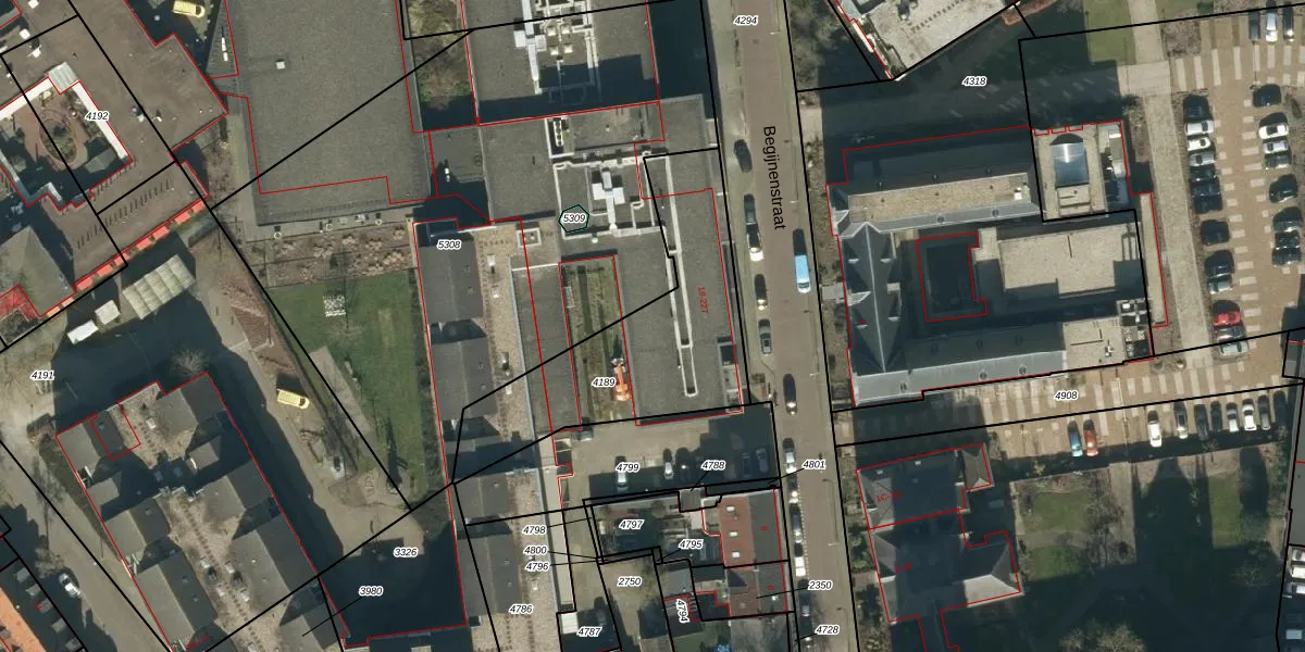 Het perceel waarop Begijnenstraat 18-C staat heeft een oppervlakte van 857 m². Dit is een groot perceel. De perceeloppervlakte wordt geregistreerd door het Kadaster. Gedetailleerde informatie over de maten van dit perceel kunt u vinden in het rapport Kadastrale kaart met maatvoering van Begijnenstraat 18-C.