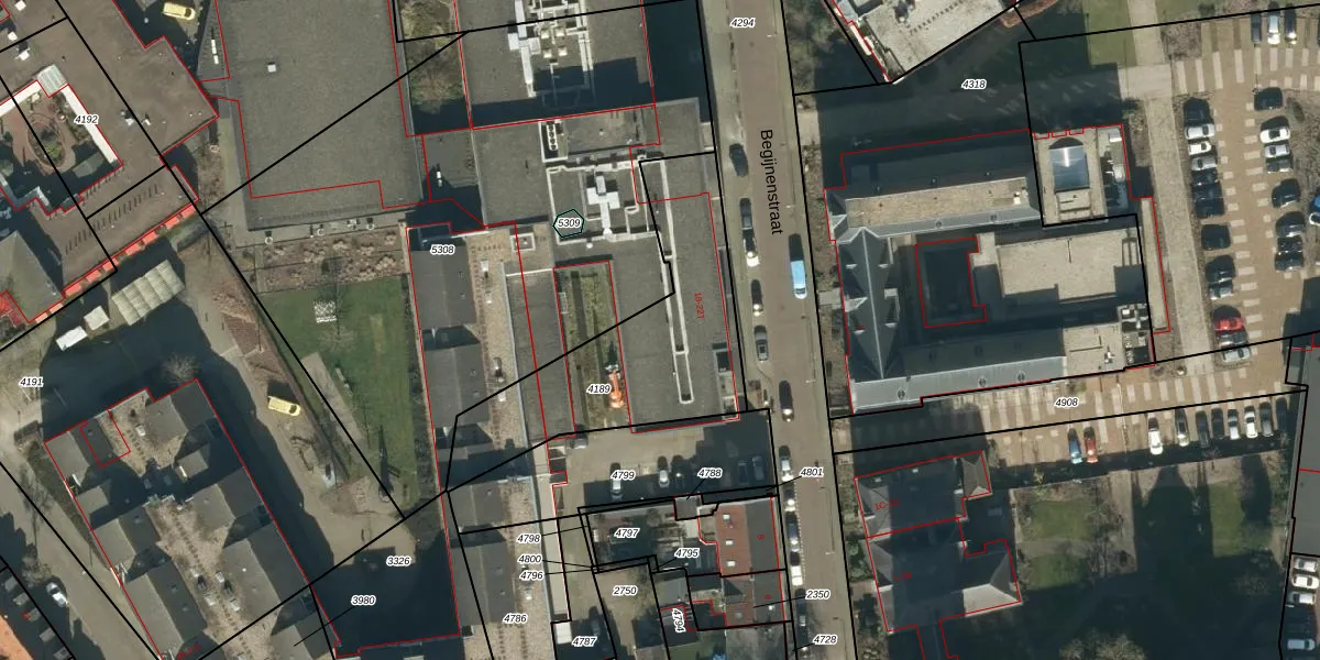 Het perceel waarop Begijnenstraat 20-G staat heeft een oppervlakte van 857 m². Dit is een groot perceel. De perceeloppervlakte wordt geregistreerd door het Kadaster. Gedetailleerde informatie over de maten van dit perceel kunt u vinden in het rapport Kadastrale kaart met maatvoering van Begijnenstraat 20-G.