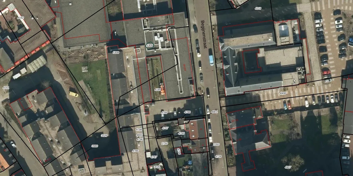 Het perceel waarop Begijnenstraat 20-H staat heeft een oppervlakte van 857 m². Dit is een groot perceel. De perceeloppervlakte wordt geregistreerd door het Kadaster. Gedetailleerde informatie over de maten van dit perceel kunt u vinden in het rapport Kadastrale kaart met maatvoering van Begijnenstraat 20-H.