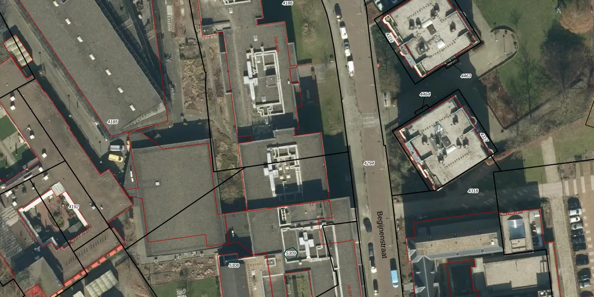 Het perceel waarop Begijnenstraat 24-F staat heeft een oppervlakte van 4242 m². Dit is een zeer groot perceel. De perceeloppervlakte wordt geregistreerd door het Kadaster. Gedetailleerde informatie over de maten van dit perceel kunt u vinden in het rapport Kadastrale kaart met maatvoering van Begijnenstraat 24-F.