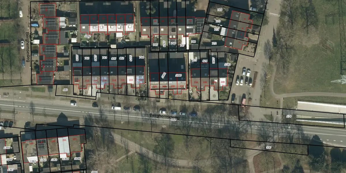 Berghemseweg 230 is gelegen op kadastraal perceel OSS00H1890. Deze kadastrale aanduiding is uniek en wordt gebruikt door het Kadaster om eigendomsrechten en andere zakelijke rechten vast te leggen. Het perceel maakt onderdeel uit van de kadastrale gemeente Oss.