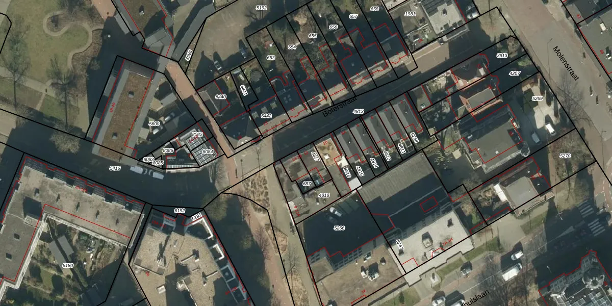 Het perceel waarop Boterstraat 12 staat heeft een oppervlakte van 81 m². Dit is een klein perceel. De perceeloppervlakte wordt geregistreerd door het Kadaster. Gedetailleerde informatie over de maten van dit perceel kunt u vinden in het rapport Kadastrale kaart met maatvoering van Boterstraat 12.