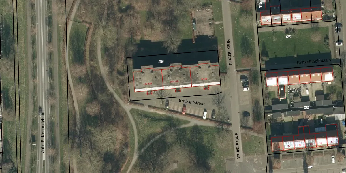 Het perceel waarop Brabantstraat 116 staat heeft een oppervlakte van 1322 m². Dit is een zeer groot perceel. De perceeloppervlakte wordt geregistreerd door het Kadaster. Gedetailleerde informatie over de maten van dit perceel kunt u vinden in het rapport Kadastrale kaart met maatvoering van Brabantstraat 116.