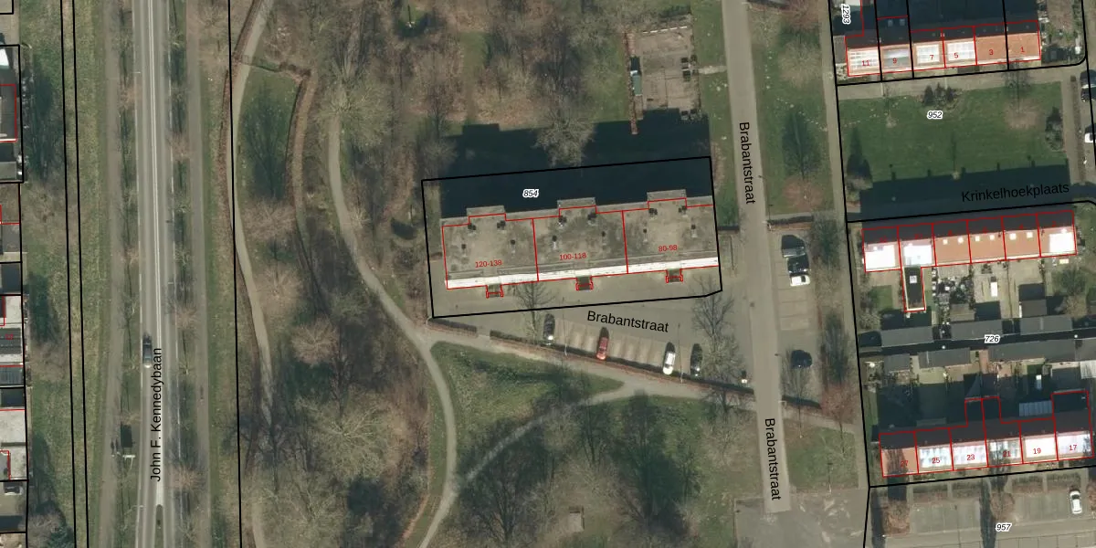 Het perceel waarop Brabantstraat 118 staat heeft een oppervlakte van 1322 m². Dit is een zeer groot perceel. De perceeloppervlakte wordt geregistreerd door het Kadaster. Gedetailleerde informatie over de maten van dit perceel kunt u vinden in het rapport Kadastrale kaart met maatvoering van Brabantstraat 118.
